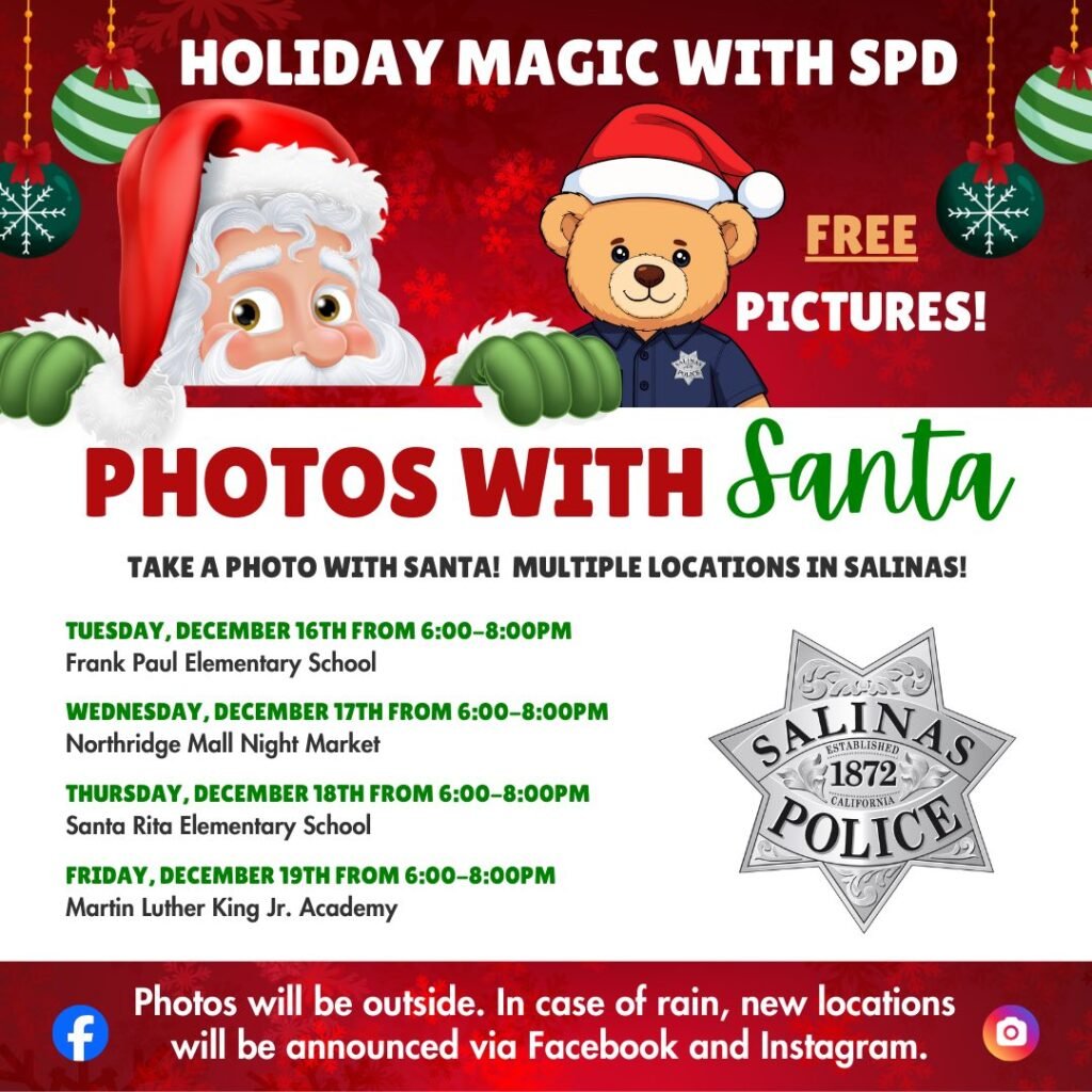 Bring the family for free photos with Santa, across multiple locations in Salinas next week. From elementary schools to the mall, Santa’s sleigh is making all the stops.